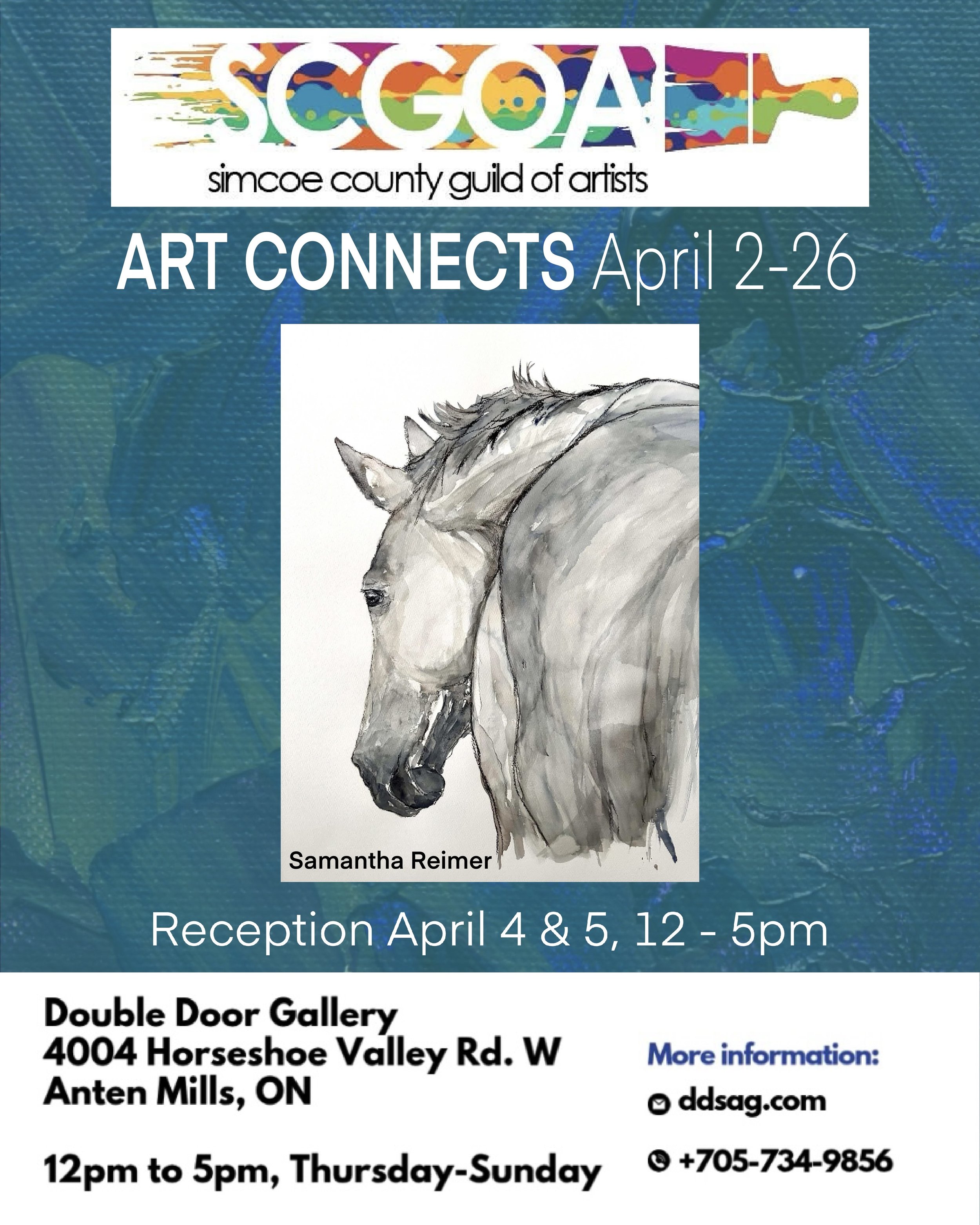 The Simcoe County Guild of Artists present “Art Connects.” An art exhibition featuring 10 local artist at the Double Door Gallery in Anten Mills, ON. The show runs April 2th - 26th, 12pm to 5pm (gallery is open Thursday to Sunday each week). There will be an opening reception with artists in attendance on Easter weekend, Saturday April 4th & Sunday April 5th.